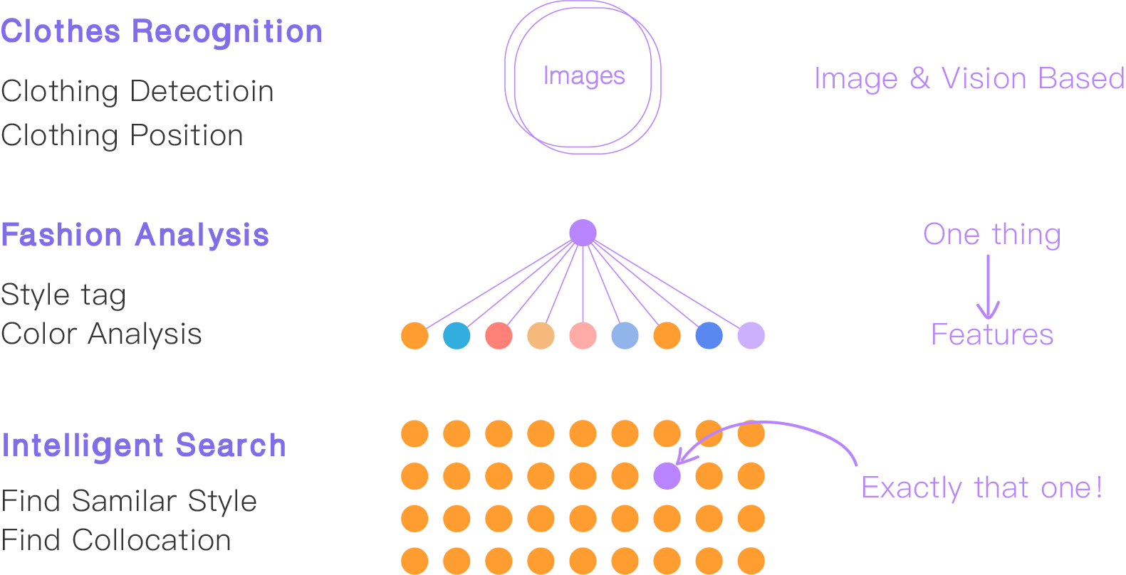 The technology is based on artificial intelligence, it can detect , analyze and searching images. With big data “haokan” screen information for users by their preference, generate purchase and collocation ideas for users individually, and deliver those ideas and useful information to users. Finally users can find their wish style rapidly and efficiently.